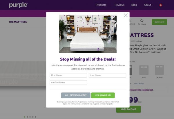 Pop-ups can work… – with an average conversion rate of 2.9% they can help with building your marketing database (if you call 2/100 help). But they are dangerous territory to navigate, as they can piss off the customers who were willing to spend dollars with you.